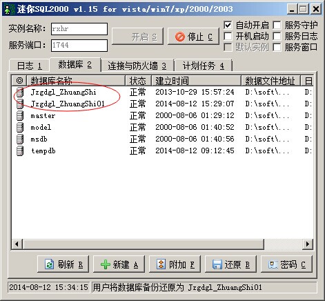 2. 數據庫還原,還原過程中需要修改數據庫名稱,與現有的數據庫名稱不同。