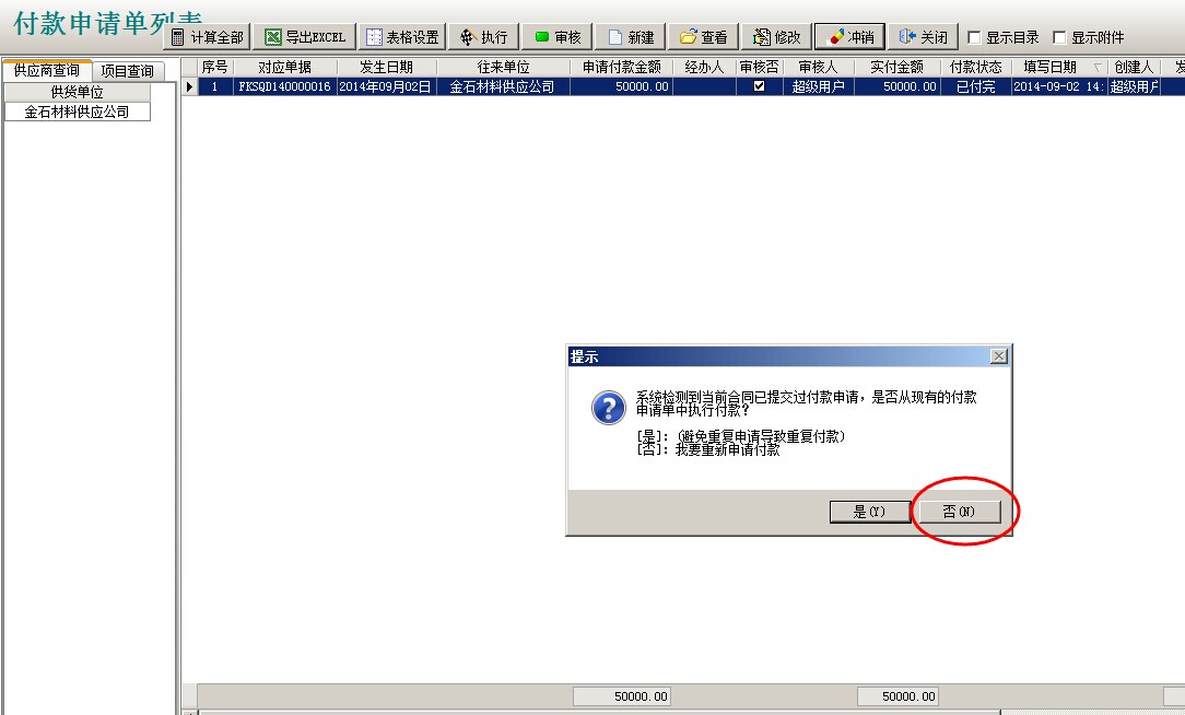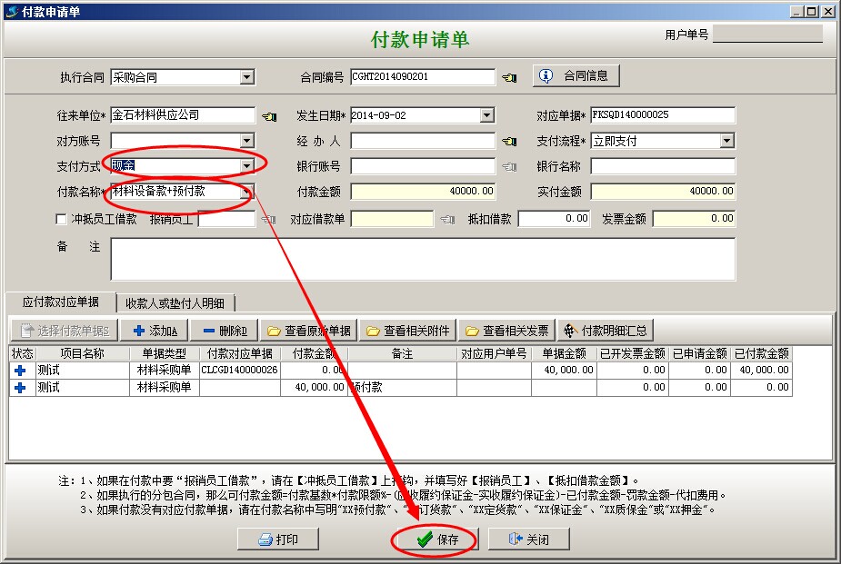 注:上圖所示;付款申請單的兩行明細為兩個材料采購單,第一行的[付款對應單據]為CLCGD140000026已付款金額40000已經等于單據金額(表示該采購單已經付完,是通過上一個付款單自動對應上的付款數),所以付款金額為0,第二行的[付款對應單據]為空,表示本項支付的款項為預付款),上面的付款名稱為材料設備款+預付款