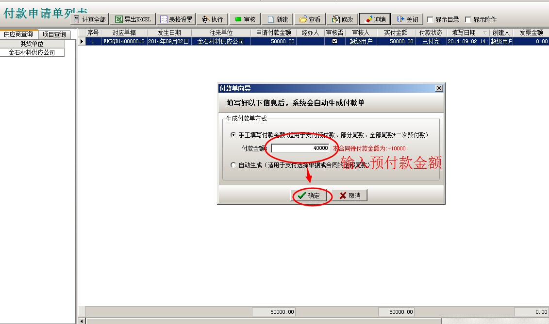 在彈出的付款單向導中輸入再次預付款金額,點確定