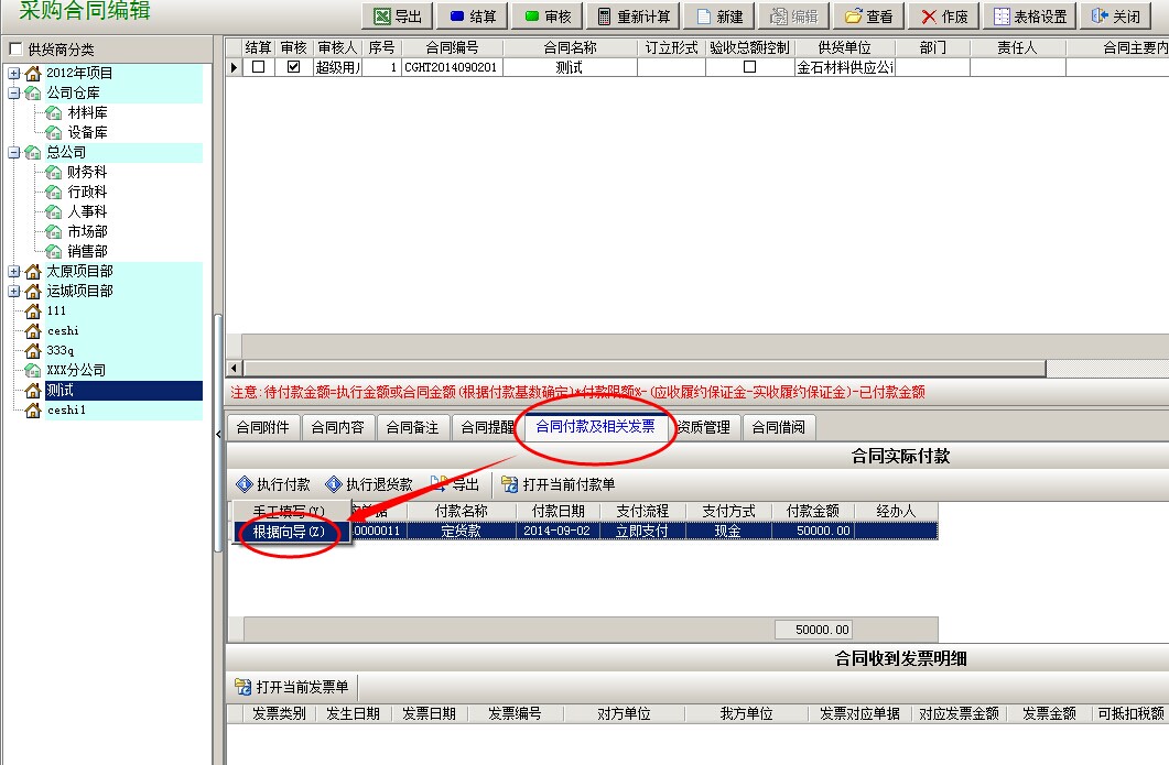 然后打開合同付款及相應發票,點執行付款,選擇第二項根據向導