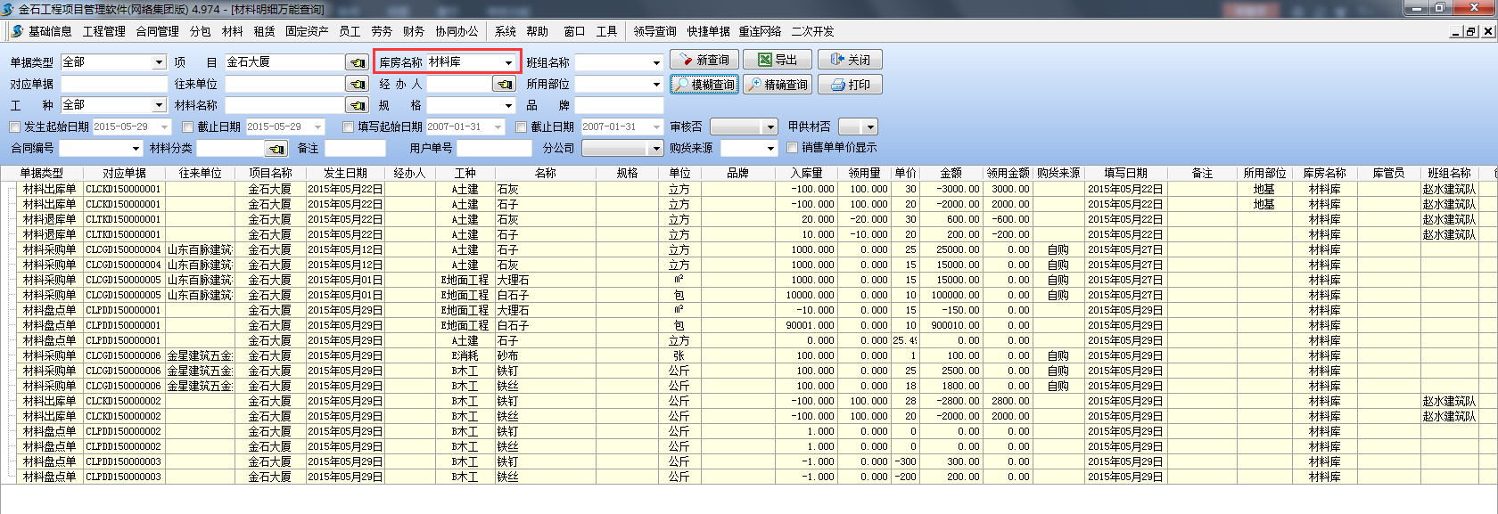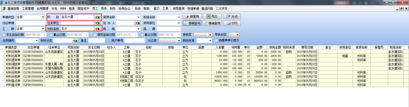 如下圖:查詢項(xiàng)目【金石大廈】所有【石子】材料的采購(gòu)記錄,(通過(guò)【模糊查詢】)