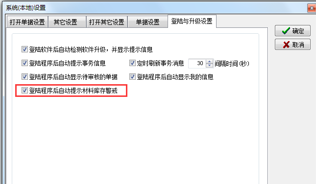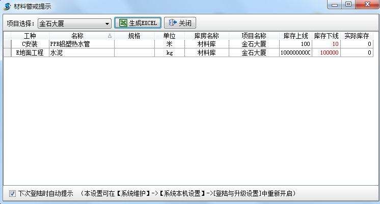 我們也可以設(shè)置登錄軟件時(shí)自動(dòng)提示庫(kù)存警戒。設(shè)置好之后當(dāng)材料的庫(kù)存量達(dá)到了預(yù)警設(shè)置中設(shè)置的上限或者下限,登錄時(shí)會(huì)自動(dòng)彈出提示。