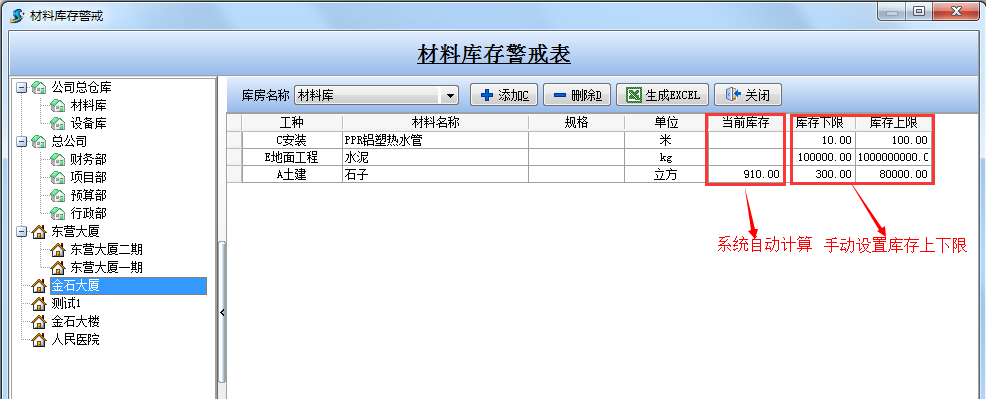 如下圖:選擇項(xiàng)目為【金石大廈】,庫(kù)房為【材料庫(kù)】后設(shè)置的庫(kù)存材料的上限、下限
