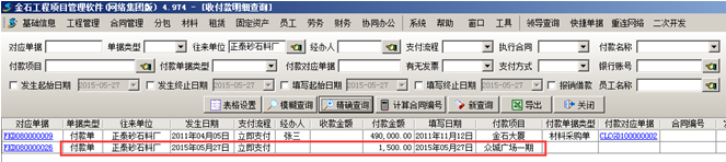 在工地現場材料管理過程中,如果沒有采購合同,材料采購入庫之后,可在“材料入庫單”列表里面,選中單據,直接點擊[付款]按鈕,添加[付款申請單],執行付款。如圖: