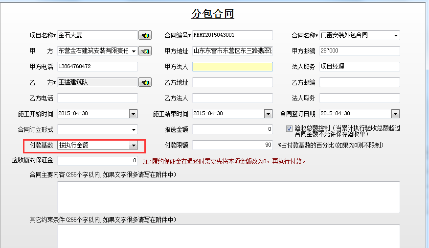 即在新建分包合同時填寫好付款限額。如下圖: