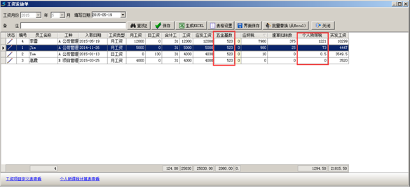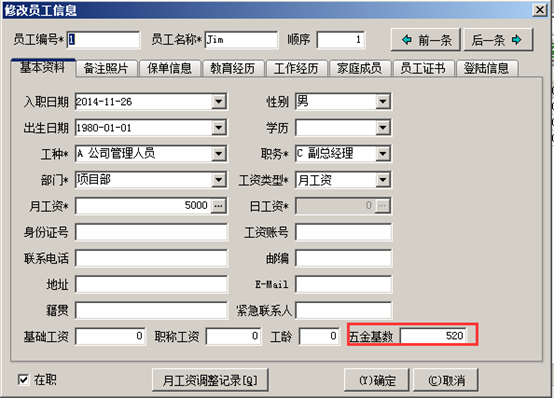 在工程項目管理軟件中生成工資表之前需要在員工維護里面設置好員工的“五金基數”,如圖: