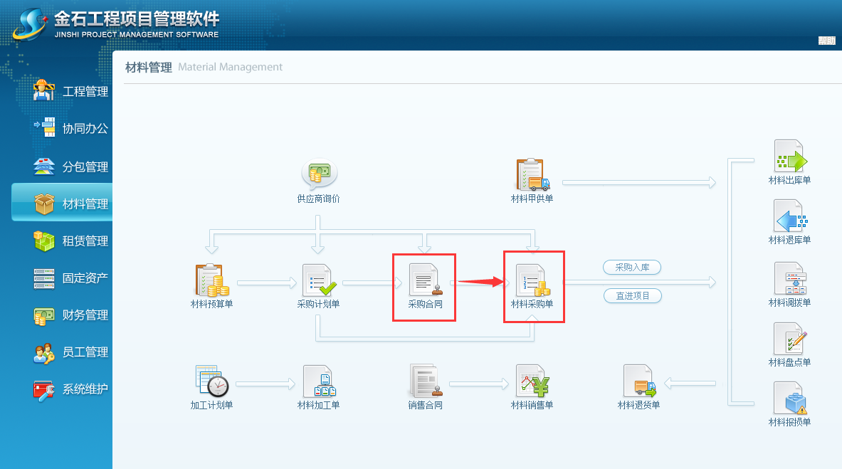建筑材料管理軟件中材料采購計劃可以根據項目對材料的需求限制材料采購的具體數量。而材料采購合同可以限制材料采購的金額,兩者的結合,可實現了材料采購的量與價的控制,從而可以利用建筑材料管理軟件的材料管理模塊控制項目的材料成本。