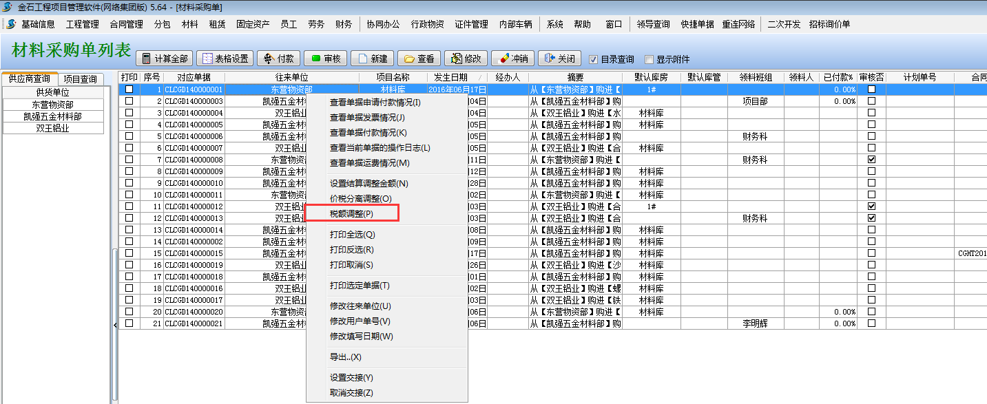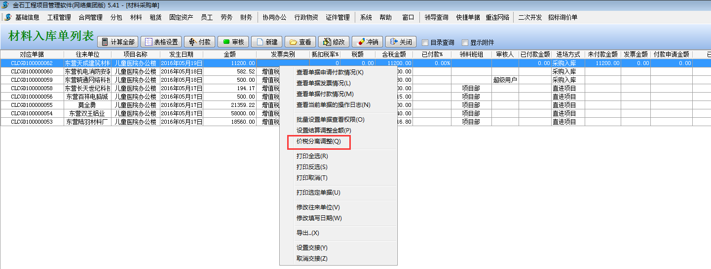 通過工程項目管理軟件價稅分離后,分離出的稅額可能與實際的稅額有一定的誤差,可通過選定單據右鍵選擇稅額調整,實現對稅額的調整。如下圖: