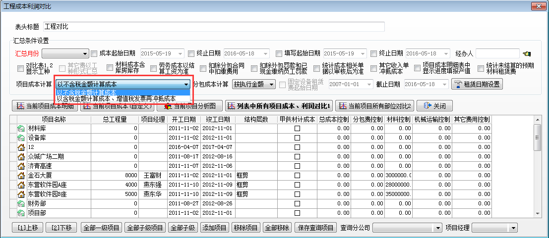 ⑵.營改增后項目成本利潤和工程經營狀況表可以選擇以“不含稅金額計算成本”或者“以含稅金額計算成本、增值稅發票在沖抵成本”兩種方式。如下圖: