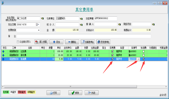 登記車輛日常費(fèi)用時,[車輛費(fèi)]、[車型]、[車牌號]為必選項,如果為這項費(fèi)用為“加油費(fèi)”,則需要在[加油費(fèi)]上打鉤。