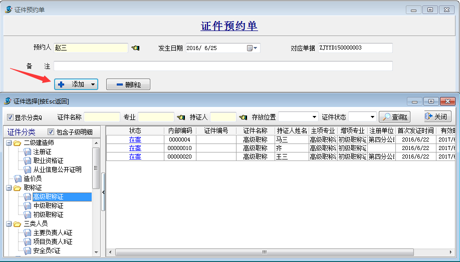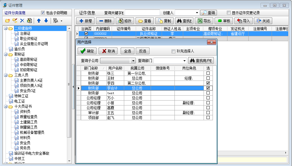 如下圖所示:證件管理的所屬部門已經由[項目部]變更為我們剛剛修改的[市場部]了