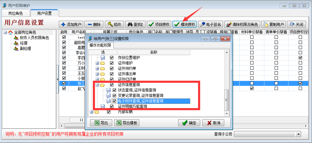 【系統維護】→【用戶權限設置】→【證件信息查詢】選擇下圖內容打勾