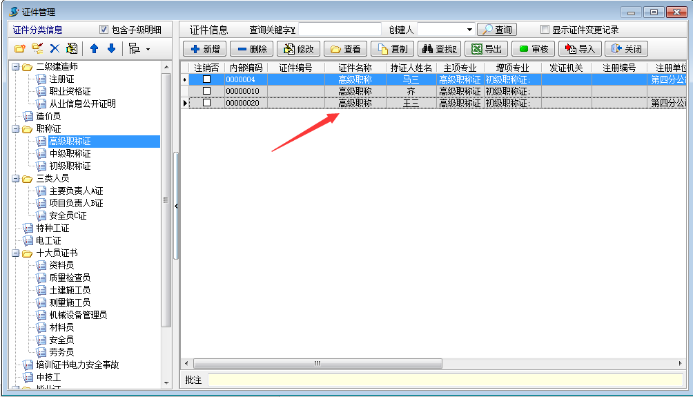 顯示證件變更記錄打勾,選擇修改(主要用于增加證件專業、所屬部門等信息的變更)