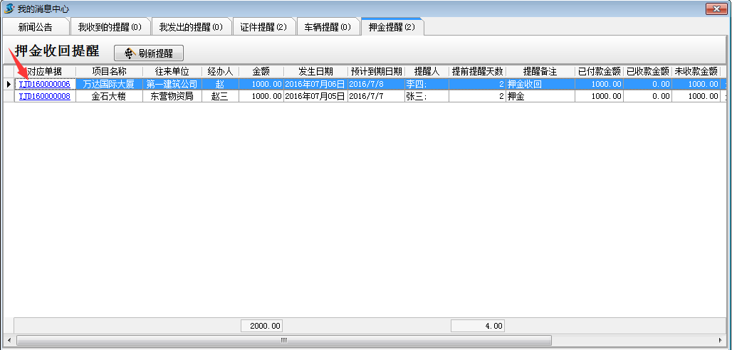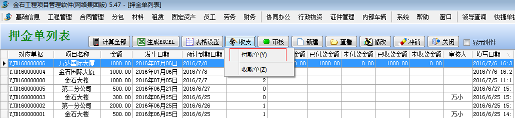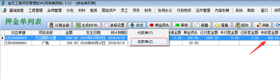 金石工程項目管理軟件押金管理未收款的計算原則: 押金已付款且“已到預計到期日期”,未收款金額=已付款金額—已收款金額—押金損失