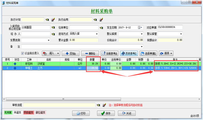備注 如上圖所示:在備注欄中系統不但會自動彈出材料的計算方式,而且在數量一欄中只保留2位小數,并將第三位以后的數字舍去,以幫助公司節省開支