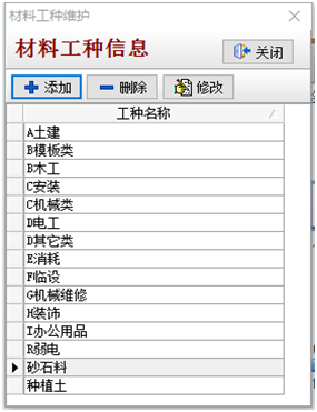 1、在材料工種維護維護中添加工種(砂石料、種植土)如下圖: