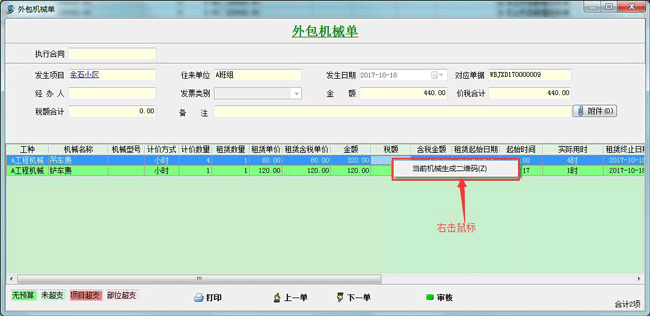 輸入發(fā)生項目、往來單位、時間、經辦人和審核流程方案并添加機械明細,然后點擊機械明細行,會彈出機械編輯窗口(如上圖右)編輯實際發(fā)生相關參數,如計價數量,機械發(fā)生的起始日期和時間和單價等后點擊生成二維碼,結果得到如下圖左,