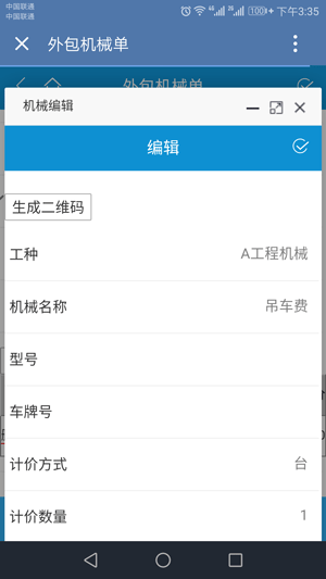 2、金石工程管理軟件手機端也可以生成二維碼,在配置好企業(yè)微信的前提下,進入手機端的單據填寫并打開外包機械單,如圖所示
