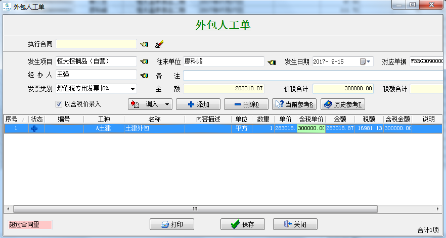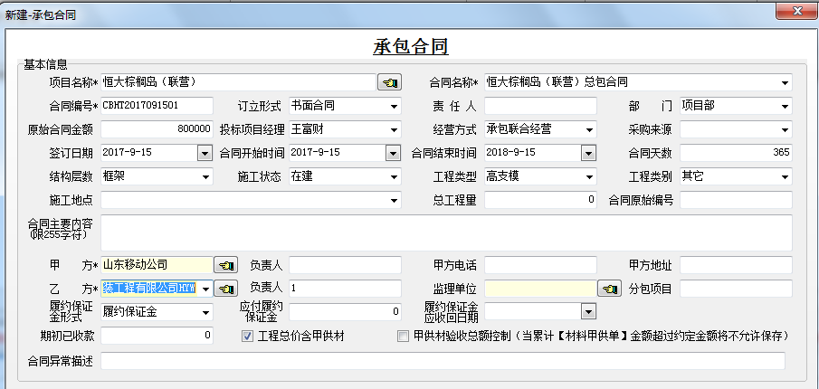 ①在“恒大棕櫚島(聯營)”項目下創建“承包合同”、“分包合同”等