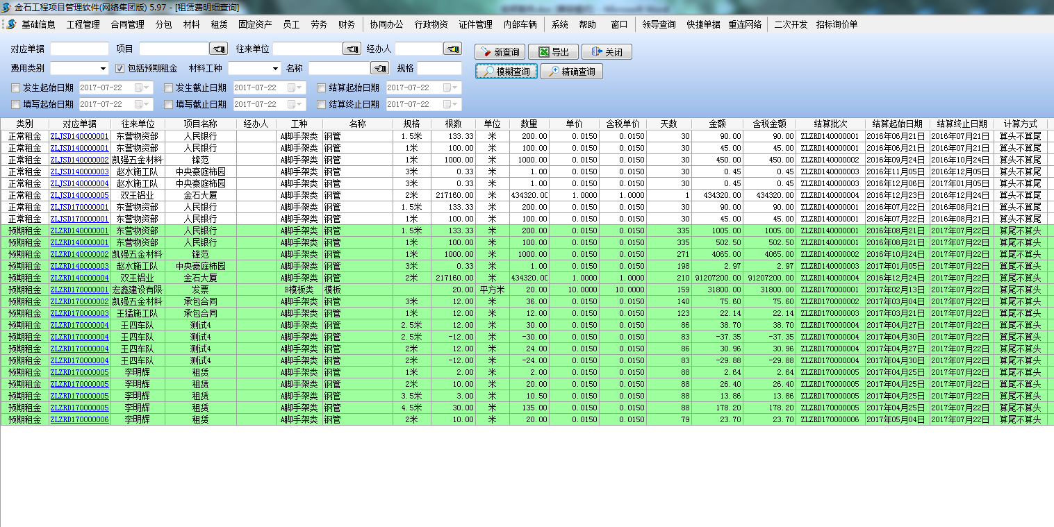在租賃管理方便,經(jīng)常租一些周轉(zhuǎn)材料,跟租賃公司都是長(zhǎng)期合作,結(jié)算方式都是采用季度結(jié)算或者年度結(jié)算,之前采用紙質(zhì)或者excel統(tǒng)計(jì),統(tǒng)計(jì)并不準(zhǔn)確,到季度或者年度結(jié)算時(shí)往往統(tǒng)計(jì)不準(zhǔn)確,都是按照供應(yīng)商提供數(shù)據(jù)進(jìn)行結(jié)算,具體租賃費(fèi)并沒有參考依據(jù)。采用金石項(xiàng)目管理軟件后,可以實(shí)時(shí)查看租賃情況,統(tǒng)計(jì)租賃庫(kù)存,并且最后結(jié)算時(shí)選好結(jié)算批次可以自動(dòng)計(jì)算結(jié)算租金。在租賃過程中并可以實(shí)時(shí)查看預(yù)期租金,評(píng)估預(yù)期成本。采用采用金石項(xiàng)目管理軟件后租金統(tǒng)計(jì)準(zhǔn)確,對(duì)后期結(jié)算產(chǎn)生了很大的幫助。