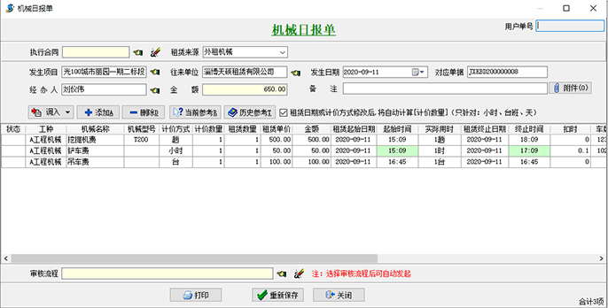 除此之外,系統會通過【機械日報單】數據,生成作為閱讀結賬對賬單據的【機械計算單】。具體操作流程如下: