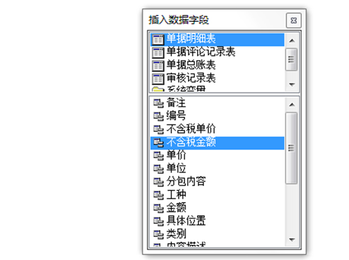 4. 系統(tǒng)和Excel最大的區(qū)別就是,我們可以直接從系統(tǒng)中調(diào)集數(shù)據(jù)。只要在懸浮窗【插入數(shù)據(jù)字段】中選擇對(duì)于的字段即可。