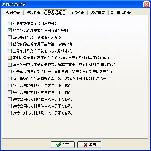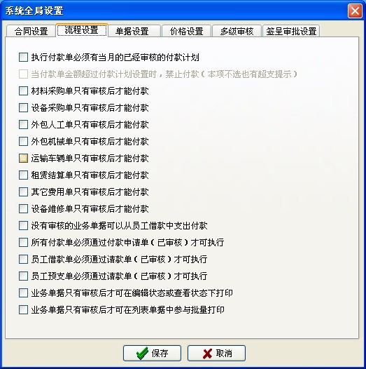 四、進行【全局設置】,用戶要根據自己公司的實際情況進行設置,多余的控制流程要去除,需要的要打鉤。如下圖: