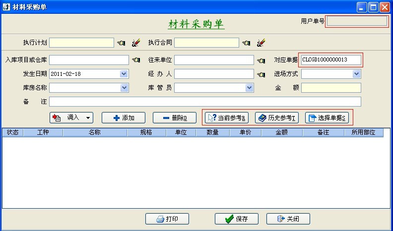 【選擇單據】:根據歷史發生的同類單據再次選擇,提高錄入效率。如:在【材料出庫單】中可以通過【選擇單據】調用【材料采購單】的入庫單明細,即要填寫的出庫材料直接從采購入庫的材料中選擇出來。