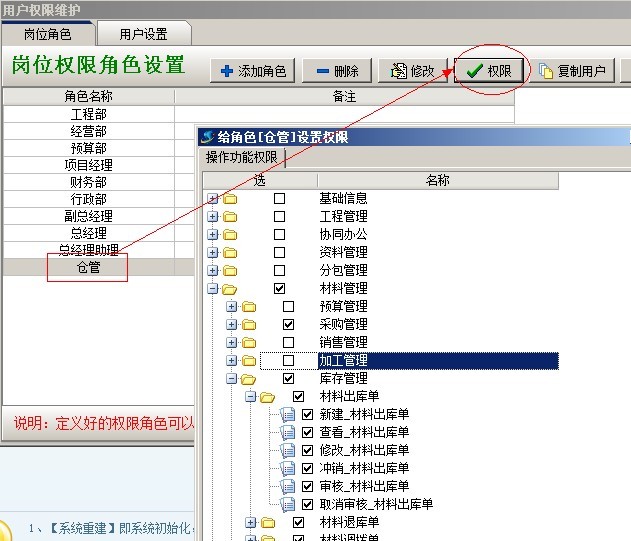 保存之后 ,選擇該崗位,再來設置這個崗位角色的【權限】。