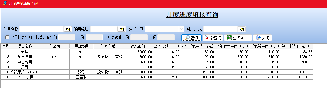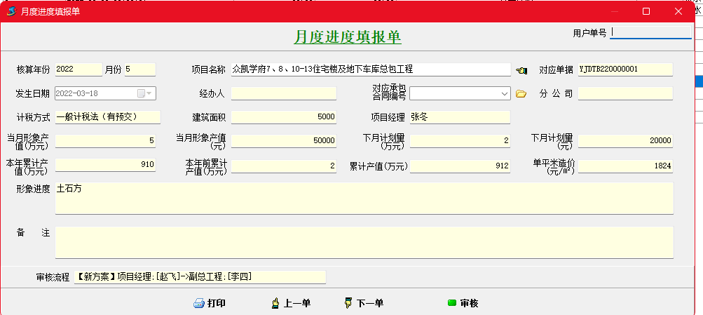 月度進(jìn)度填報(bào)單可以實(shí)現(xiàn)按月上報(bào)形象產(chǎn)值進(jìn)度并自動(dòng)統(tǒng)計(jì)當(dāng)年度產(chǎn)值,總產(chǎn)值以及單平米造價(jià)。可以可以根據(jù)上報(bào)的產(chǎn)值計(jì)算待收款以及利潤(rùn)。