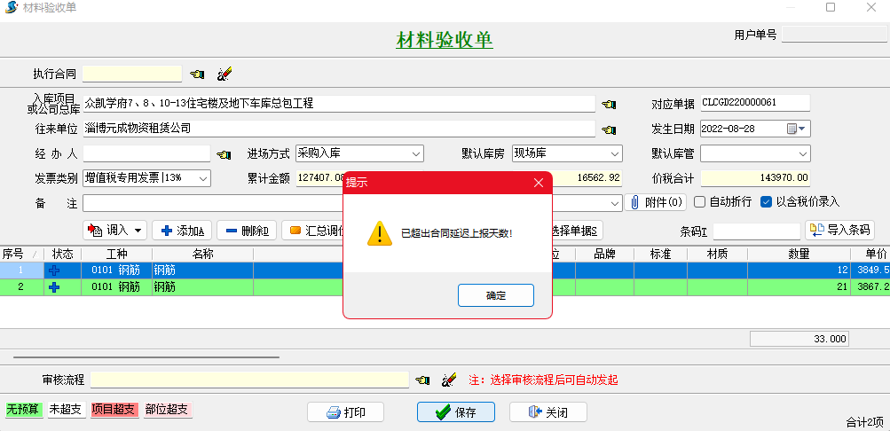 為了控制單據(jù)延遲上報時間,金石工程項目管理軟件專門開發(fā)了機械日報單、材料采購單、外包機械單、其它費用單、外包人工單、采購變更單、分包變更單、租賃變更單、其它變更單、銷售變更單等單據(jù)延遲上報天數(shù)設置。也就是企業(yè)可以自定義單據(jù)延遲上報天數(shù),單據(jù)發(fā)生日期超出上報天數(shù)時不允許保存。