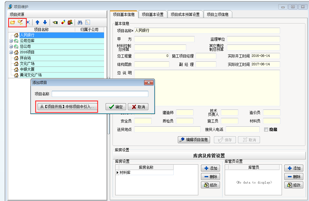 項目中標,在施工項目管理軟件項目維護建立項目,選擇從【項目開拓】中標項目中引入。如下圖: