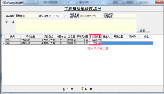 然后點(diǎn)“添加”按鈕,在彈出的“工程量清單選”窗口中選擇需要填報(bào)的清單內(nèi)容,然后在本次完成量處輸入已完成的工作量,如圖: