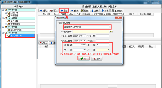 如下圖所示,在彈出的“項(xiàng)目部位分解及工程量清單設(shè)置”窗口中點(diǎn)“添加”按鈕,然后依次填寫(xiě)項(xiàng)目部位名稱(chēng)、工程量、單位等相關(guān)信息,