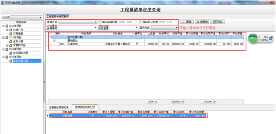2.選中相應(yīng)的項(xiàng)目,點(diǎn)查詢(xún),查看工程量清單進(jìn)度。也可輸入查詢(xún)條件進(jìn)行查詢(xún),如圖: