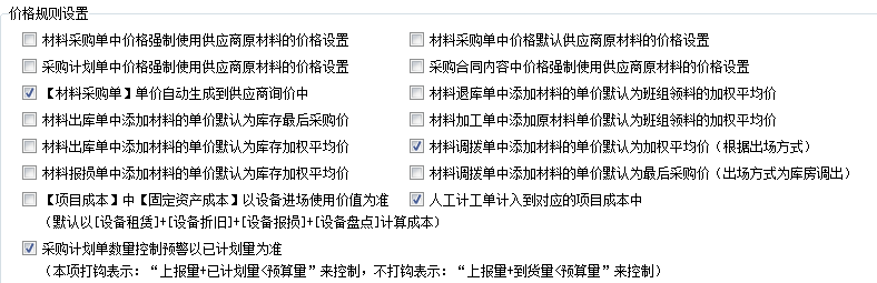 4、價格規(guī)則設置,里面包括材料計劃單、材料采購單及采購合同中材料價格幾種選擇方式,如強制使用原材料價格和默認使用原材料的價格。材料采購單單價自動生成到供應商詢價中,材料出庫單中添加材料的單價默認為庫存最后采購價,材料退庫單中添加材料的單價默認為班組領(lǐng)料的加權(quán)平均價,材料調(diào)撥單中添加材料的單價默認為加權(quán)平均價(根據(jù)出場方式)等開關(guān)。特別的,采購計劃單中,若以“上報量+已計劃量<預算量”來控制,需要開啟此開關(guān)。