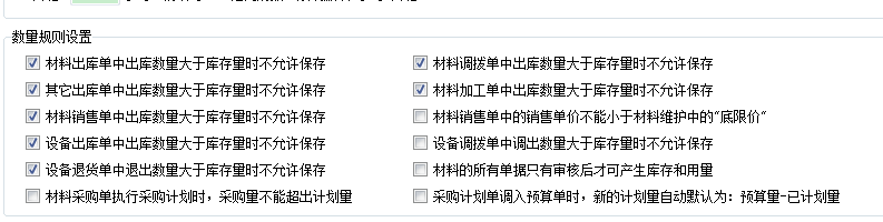 5、數(shù)量規(guī)則設置,在此開關(guān)中主要涉及,出庫數(shù)量大于庫存時是否允許保存。比如材料出庫單中出庫數(shù)量大于庫存時不允許保存。關(guān)于計劃單的開關(guān),如材料采購單執(zhí)行采購計劃時,采購量不能超過計劃量,采購計劃單調(diào)入預算是,新的計劃量自動默認為:預算量-已計劃量。