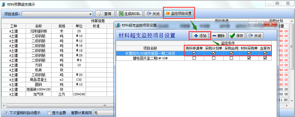 新版本中的預算超支提示可按不同項目分別設置預算與“材料管理”中一系列的單據進行對比如下圖:預算量分別對比 “用料申請單” “采購計劃單” “采購合同” “材料采購單” 是否包含“庫存” (老版本中只有兩量對比且不能按項目區分設置)