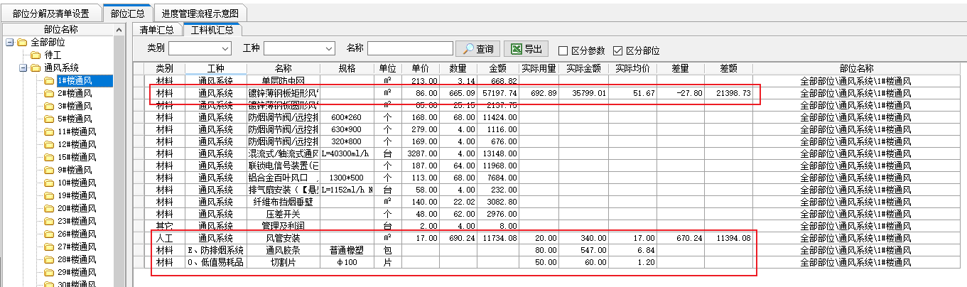 【部位分解工程量清單設置】->【工料機匯總】中新增體現實際用量、實際均價、實際金額、差量和差額等,如下圖所示,