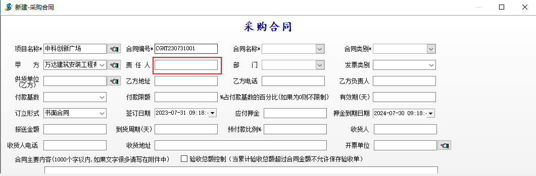 2、采購合同新建時,責任人留空,不再帶入上次記錄內容。