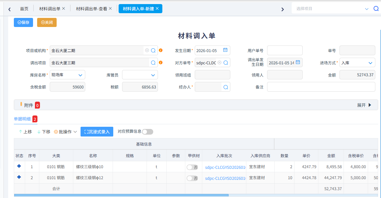 項目與項目或者公司總庫與項目之間調(diào)撥材料時由調(diào)出方填寫材料調(diào)出單,收入方填寫材料調(diào)入單,其中調(diào)入單必須根據(jù)材料調(diào)出單生成,調(diào)出單含稅金額會產(chǎn)生雙方的應收應付,后期可使用內(nèi)部資金劃轉(zhuǎn)單進行資金支付。 材料調(diào)出單中發(fā)票類別選了帶稅率的類型,稅金也能調(diào)撥,為后續(xù)項目稅金月結(jié)單使用。