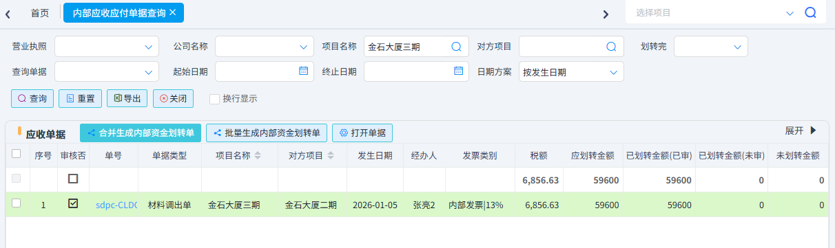 調(diào)出單含稅金額會產(chǎn)生雙方的應收應付,后期可使用內(nèi)部資金劃轉(zhuǎn)單進行資金支付