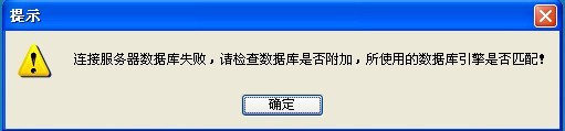 如果彈出錯(cuò)提示:“連接服務(wù)器數(shù)據(jù)庫失敗,請檢查數(shù)據(jù)庫是否附加,所使用的數(shù)據(jù)庫引擎是否匹配”