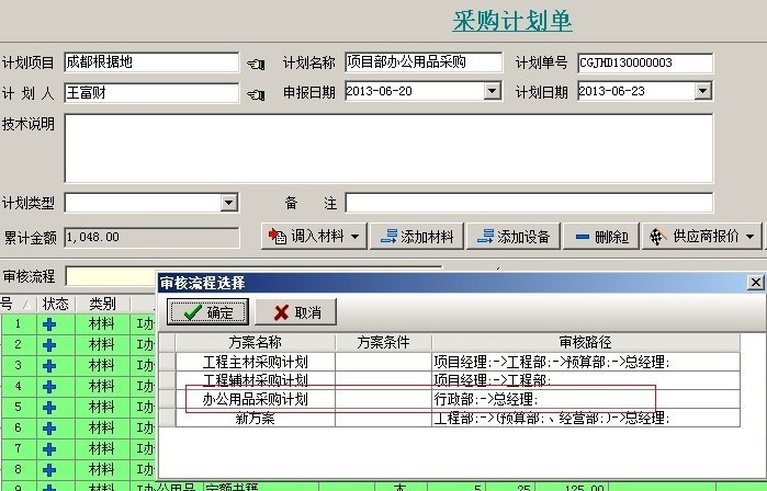 方案設(shè)置完成后,用戶在創(chuàng)建單據(jù)的時(shí)候根據(jù)不同的情況就可以選擇不同的方案,例如:如果公司行政部要采購辦公用品,那么他們在做采購計(jì)劃單的時(shí)候,審核方案就可以選擇辦公用品方案。如下圖:
