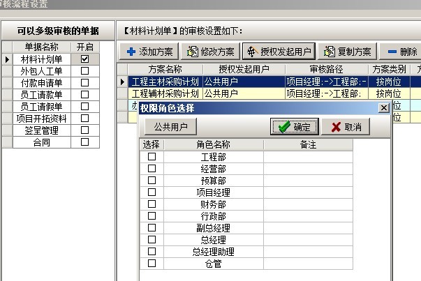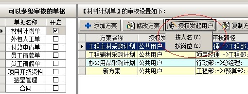 審核流程設(shè)置完成后,保存生效,然后再設(shè)置授權(quán)發(fā)起用戶,在新建審核方案的界面上,選中審核方案,點(diǎn)擊【授權(quán)發(fā)起用戶按鈕】。這是會(huì)彈出按人名和按崗位兩種模式,按人名授權(quán)就是在彈出的窗口中選中需要授權(quán)的用戶(其中公共用戶是指的全部用戶),按崗位授權(quán)就是在彈出的窗口中選中需要授權(quán)的崗位,統(tǒng)一崗位下所有用戶被授權(quán)。如下圖:
